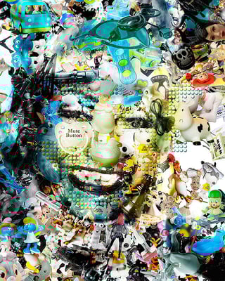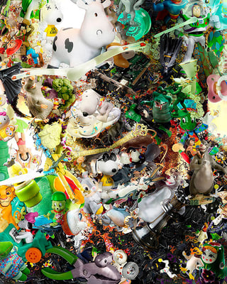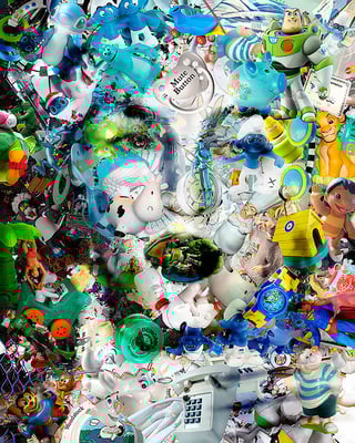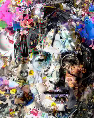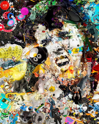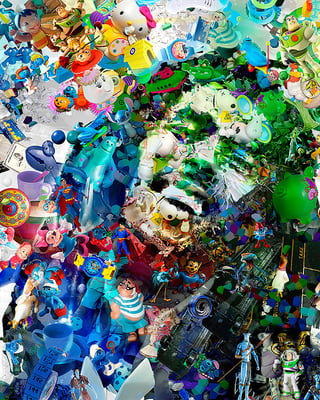 Instalaciones de Arte realizadas con juguetes reciclados, cuando las personas se acercan a mirar la obra, solo ven muchos juguetes sueltos y cuando toman una foto con su celular, pueden ver el rostro de su cantante favorito.