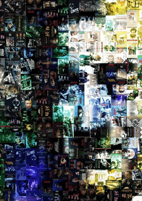Es un Collage hecho con CDs y DVDs de las películas mas representativas de actores famosos de Hollywood, donde el público puede interactuar tomando una foto con su celular y a través de este puede ver el rostro escondido de cada celebridad.